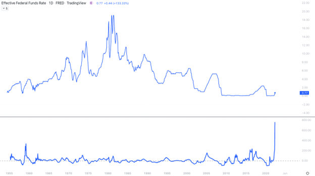 Haber llevado las tasas de 0 a 0.75 en solo dos reuniones (FOMC meetings) ha sido bastante agresivo, y la gráfica arriba nos muestra eso. La parte debajo es el cambio de la Tasa de Fondos Federales. La TFF no ha visto aumentos de .5 desde el 2000.
