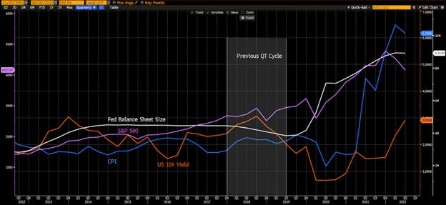 La última vez que vimos una restricción cuantitativa fue en el periodo del 2018-2019. El resultado fue que la Reserva Federal se excedió en cuanto a la meta que tenían, casi causando un mercado bajista y una recesión. Como pueden ver arriba, el IPC (índice de Precios al Consumidor) subió durante un periodo que se supondría que sería des inflacionario.
