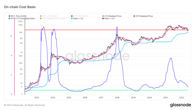 Primero, el costo según la data on-chain: Esta métrica compara el costo de compra de los inversionistas a corto plazo (STH) con los inversionistas a largo plazo (LTH). La relación entre ambas es la line azul oscura (ver debajo). Cada vez que el costo de los LTH cruza por encima de los STH, bitcoin llega a una oportunidad única de compra. Estamos cerca, pero todavía nos falta por llegar. El costo de los STH esta en 36,600 y el de los LTH en 22,300.