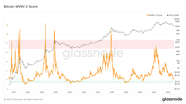 A continuación tenemos una métrica que analiza la volatilidad de BTC con el precio actual, y antiguos bear markets indican que deberíamos llegar a la zona verde: