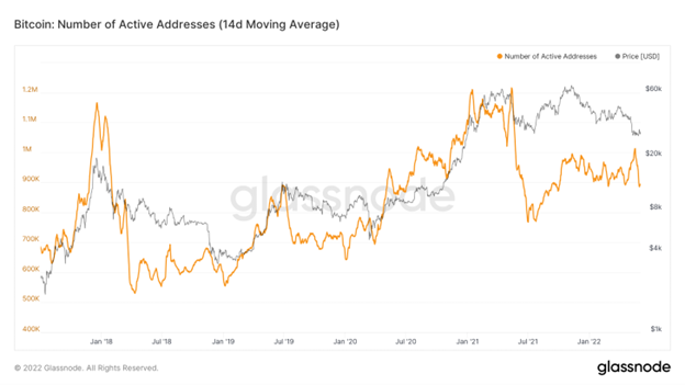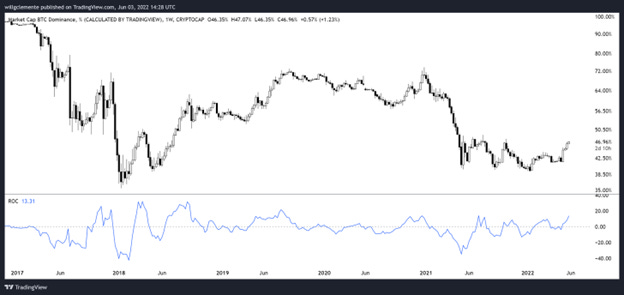 El bitcoin dominance continua en aumento, subiendo un 19% de su punto mas bajo. Esto significa que ahora BTC tiene un 47% del total de la capitalización de mercado de las criptomonedas. Esto indica liquidez volviendo a BTC luego de un agresivo comportamiento de las altcoins en 2021. Esta es una dinámica saludable que también tuvo lugar en la ultima mitad del bear market del 2018. Liquidez volviendo a bitcoin permite que se forme una base sólida para el próximo bull run hasta que la liquidez se disperse nuevamente, cuando el mercado se diluye con el nuevo numero de productos, pero no hay capital suficiente para que sea sostenible, y se repite el ciclo.