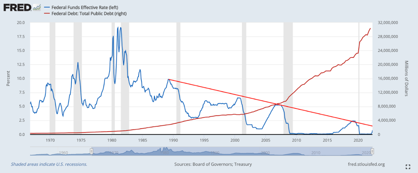 Esta expansión de la deuda ha sido promovida por tasas de interés que se han ido acercando a 8 desde los 80. Con costos más y más bajos para financiarse, la cantidad de dólares circulando aumentando, el poder de compra bajando, los beneficios de ahorrar para el futuro se han visto reducidos.