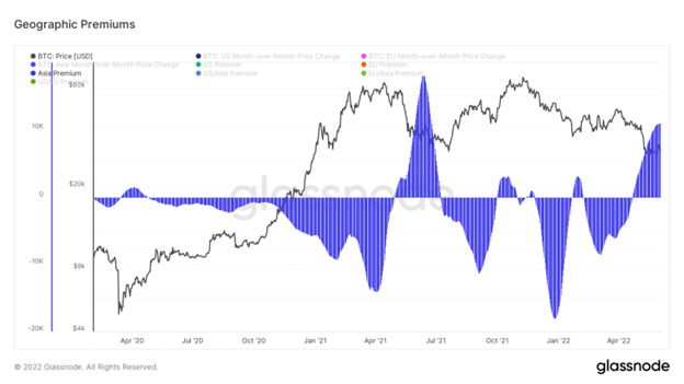 Por último, es interesante ver el trading en Asia durante los últimos meses, ya que la gráfica debajo indica que este continente ha dominado el mercado de bitcoin en los últimos dos años.