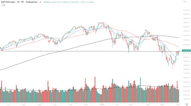 El S&P también cerro por encima de la resistencia, aunque con un volumen muy bajo. El 50-day SMA sería un lugar lógico para ver los precios devolverse, así que pendientes de ese momento si llega.