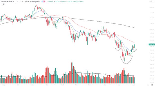 El soporte, que ahora es resistencia, en alrededor $188 es un lugar importante para el Russell ETF. El jueves el cierre fue por encima de este valor, señalando una posible corrida alcista. Este patrón parece ser un Hombro-Cabeza-Hombro invertido, pero es difícil saber si este realmente fue el fondo de este movimiento correctivo.