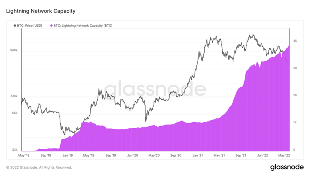 Por el otro lado, cuando vemos el lightning network, la capacidad continúa aumentando. Aunque el lightning network es pequeño y esta en su infancia, la tasa de cambio aun en estas condiciones del mercado, indican cosas positivas.