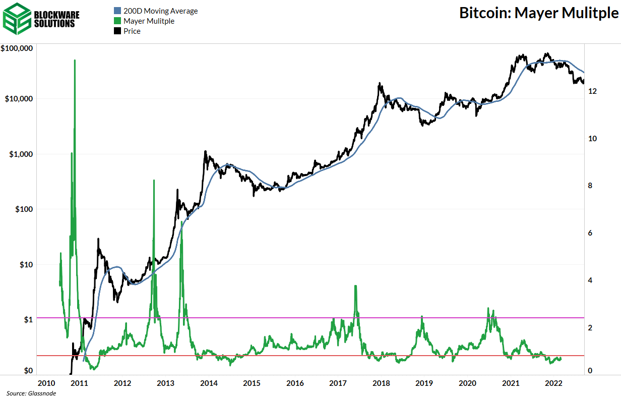 El múltiplo de Mayer es la relación entre el precio y la media móvil de 200 días. El promedio móvil de 200 días es un buen indicador relativo de un mercado alcista contra bajista. A medida que el precio de BTC va más allá del promedio móvil de 200 días, es un buen indicador de que BTC está sobrevendido.