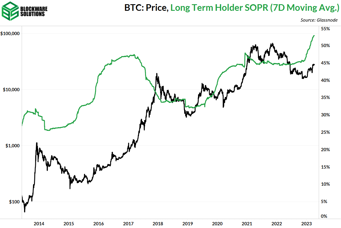 Históricamente, esta métrica ha servido como soporte durante las fases alcistas, ya que los tenedores a corto plazo tienden a defender su base de costo con compras; por lo tanto, es razonable esperar que BTC no caiga por debajo de ~ $ 22,000. Este piso continúa aumentando a medida que las compras al precio actual aumentan la base de costos de los tenedores a corto plazo.