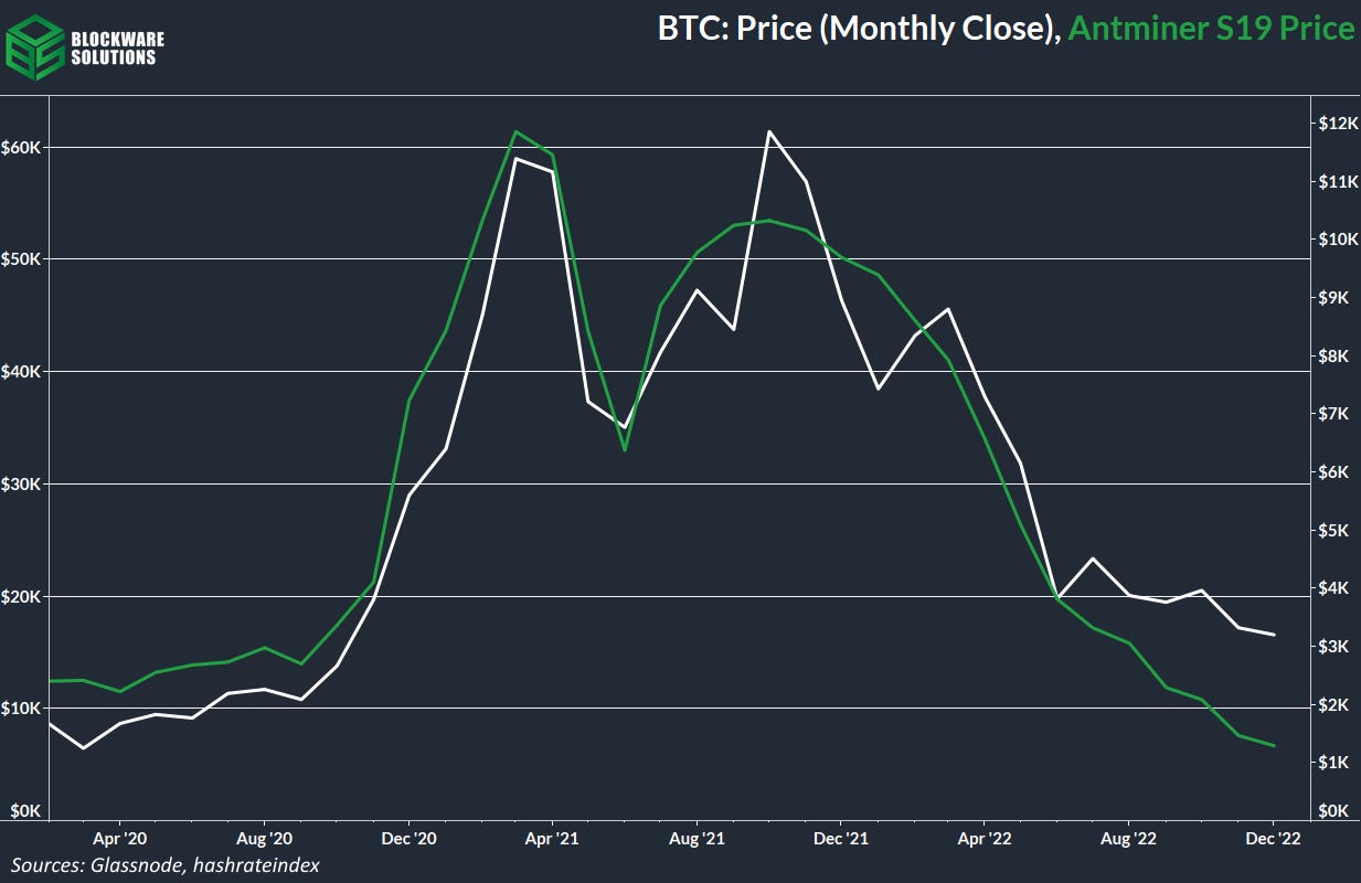 A continuación se muestra el precio de mercado histórico de una máquina S19 95T (34,2 W/TH) según el índice Hashrate. Los mineros sobreapalancados están siendo liquidados activamente, lo que obliga a sus acreedores a tomar posesión y, en ocasiones, vender miles de plataformas usadas en el mercado secundario.