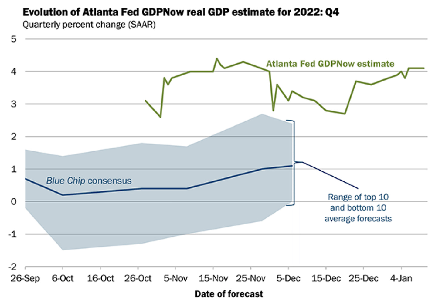 La estimación actual del Fed Bank of Atlanta es que el PIB creció un 4,1 % en el cuarto trimestre de 2022. El aumento del PIB combinado con un mercado laboral sólido hace que sea difícil argumentar que EE. UU. se encuentra actualmente en una recesión.