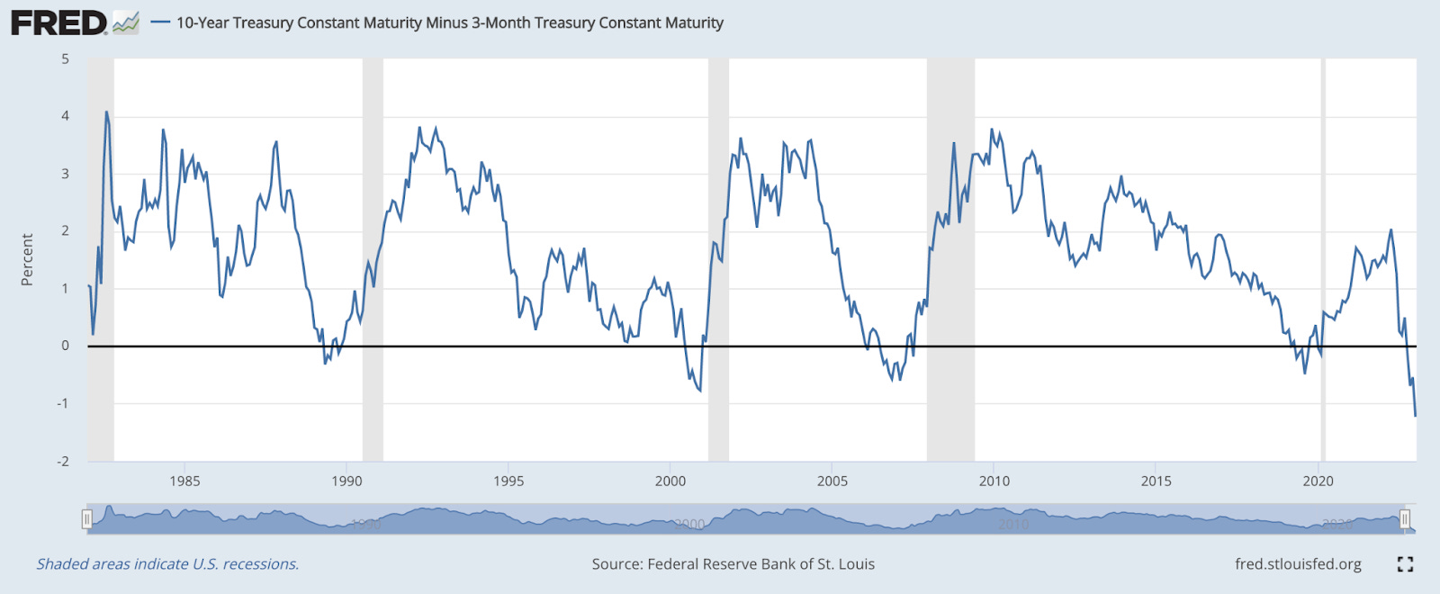 El gráfico anterior muestra la diferencia entre los rendimientos del Tesoro a 3 meses y a 10 años. Este diferencial cerró en -1,23% el jueves, su lectura más baja en la historia moderna.