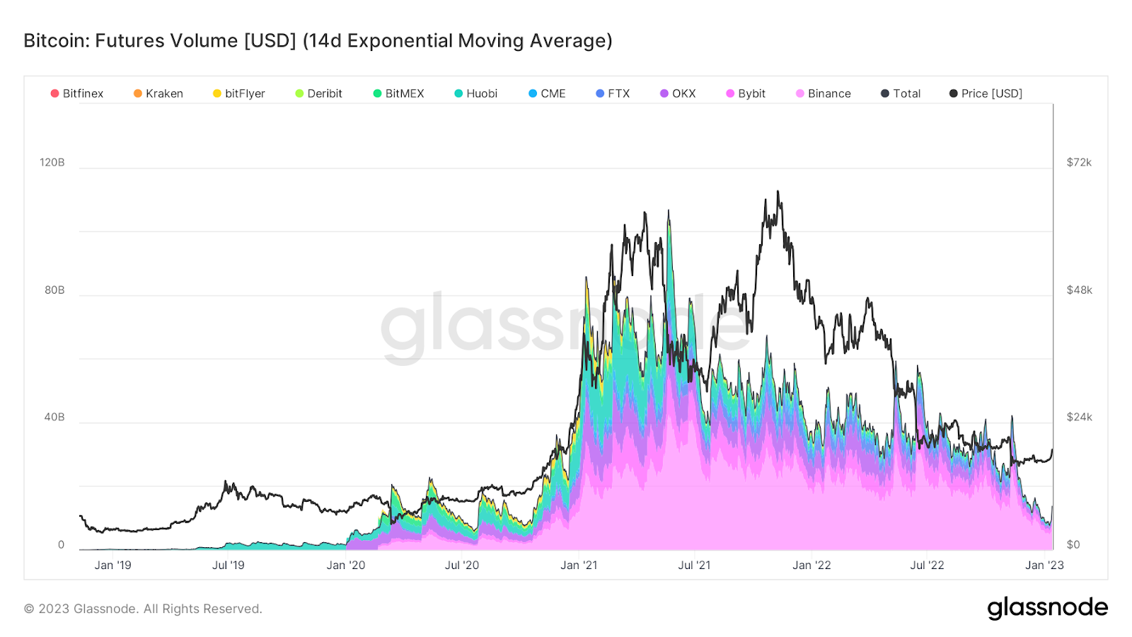 La suma del volumen de futuros en todos los intercambios alcanzó su nivel más bajo desde octubre de 2020.