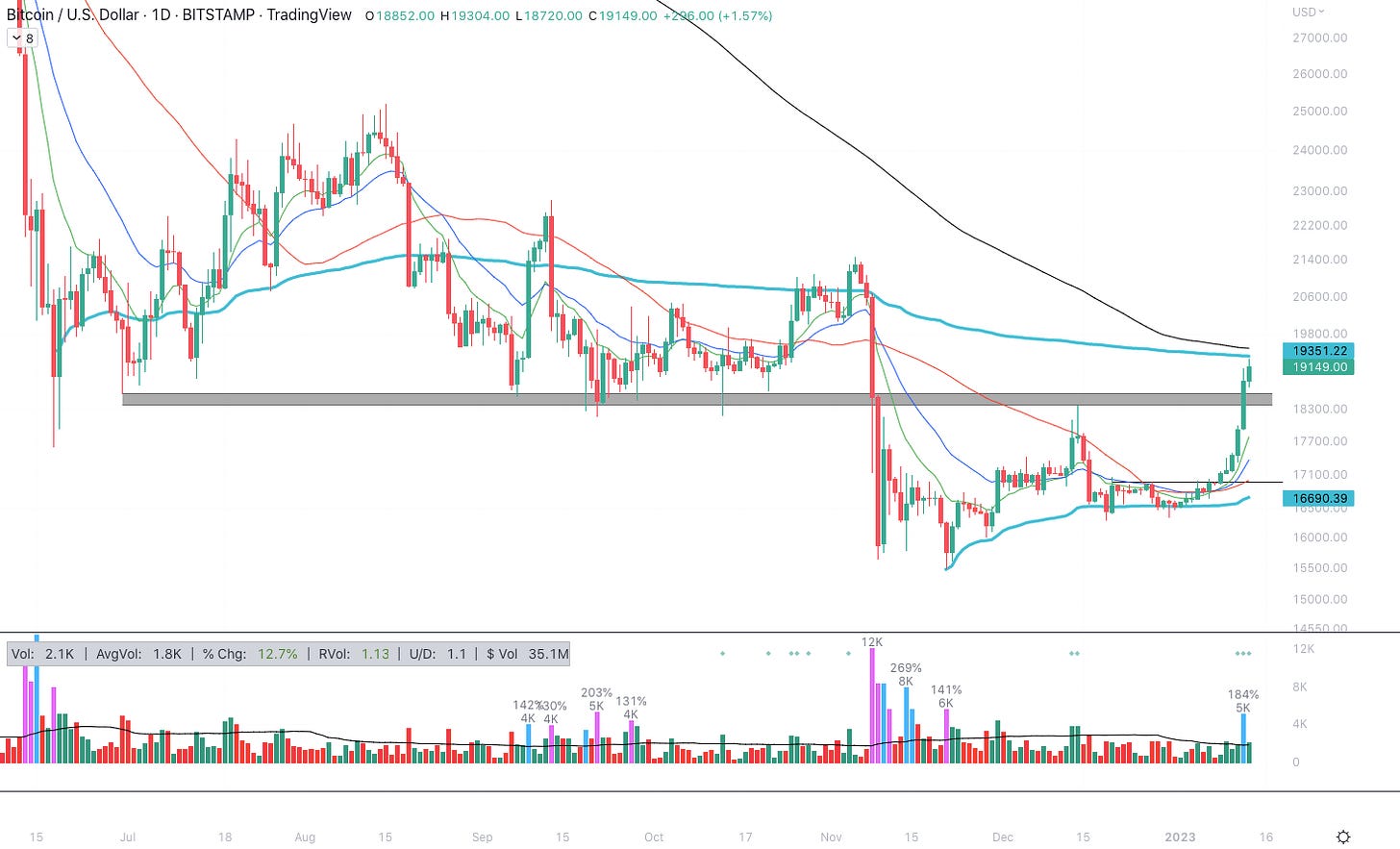 Al momento de escribir, BTC ha subido casi un 13% en la semana y se acerca a su SMA de 200 días a $19,500.