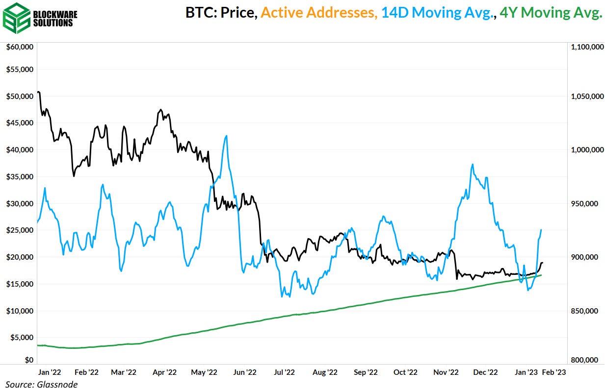 Tal intersección ocurrió recientemente. Sin embargo, al acercarnos, hemos visto que la 14DMA se recuperó muy bien esta semana; El impulso positivo en las direcciones activas es una señal de una creciente actividad en la red que podría sacarnos del mercado bajista.