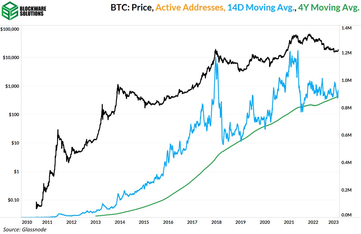 Las direcciones activas se definen como la cantidad de direcciones únicas involucradas en el envío o la recepción de BTC en un día determinado. Durante los mercados alcistas, se vuelve parabólico, denotado por la 14DMA que se extiende mucho más allá de la 4Y, ya que muchas personas usan la red Bitcoin. La actividad es más baja durante los mercados bajistas o los fondos locales; puede ver esto en los puntos en los que se cruzan 14DMA y 4Y.