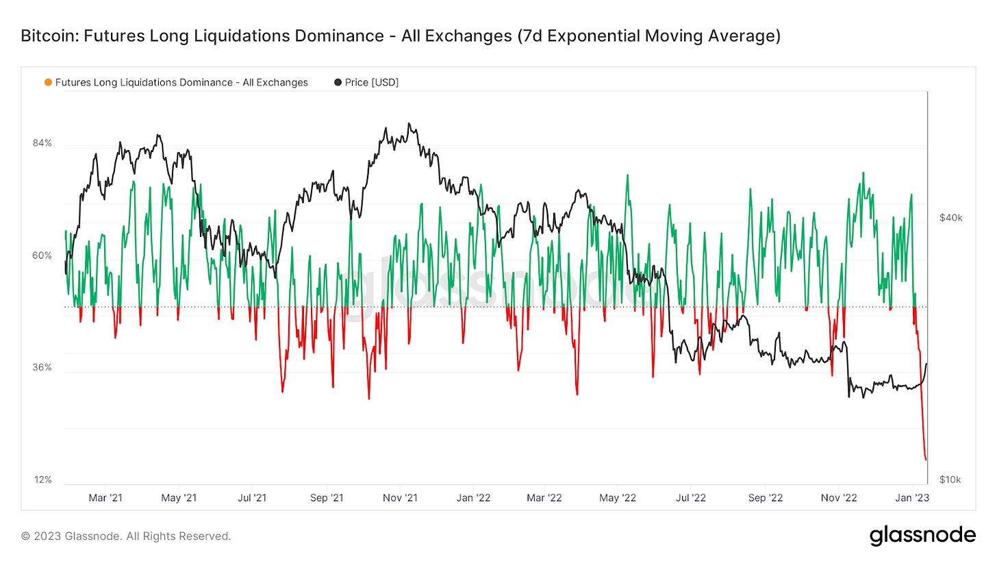 El dominio de las liquidaciones largas mide el porcentaje de liquidaciones largas frente a las liquidaciones cortas. Menos del 50% indica liquidaciones más cortas. Hemos visto la mayor cantidad de liquidaciones cortas en relación con liquidaciones largas desde que este conjunto de datos apareció por primera vez hace dos años.