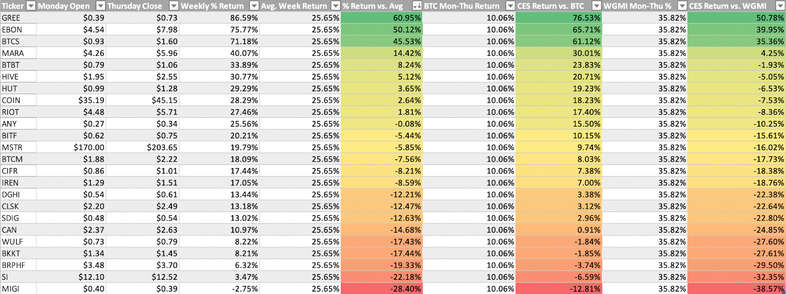 Como siempre, puede mirar arriba para ver el rendimiento del precio semanal de varias acciones criptográficas en comparación con BTC y el ETF de minería de Valkyrie.