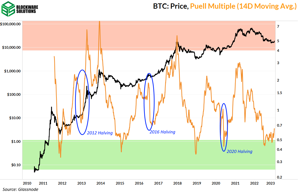 La segunda información se refiere a la reducción a la mitad. Debido a que esta es una medida del valor en USD del subsidio en bloque, y no solo el valor en USD de todos los Bitcoin, puede ver las fuertes caídas cuando se produjeron las reducciones a la mitad. La señal aquí viene cuando te das cuenta de lo rápido que el múltiplo de Puell vuelve a su nivel anterior a la mitad. Debido a que la cantidad de BTC emitida en el subsidio literalmente se reduce a la mitad, la única forma de que esta métrica se recupere tan rápidamente es que el precio de BTC aumente rápidamente.
